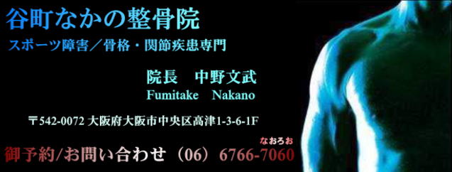 スポーツ障害/骨格・関節疾患 谷町なかの整骨院 〒542-0072 大阪府大阪市 中央区高津1-3-6-1F Tel/Fax(06)6766-7060 |